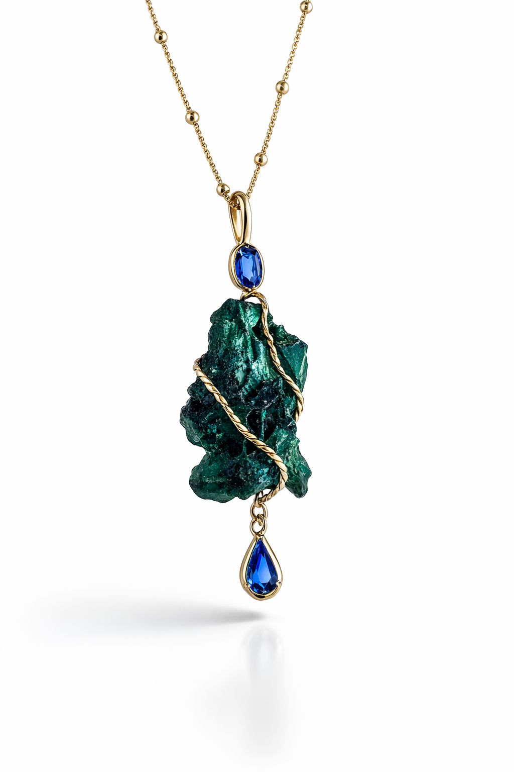 El delicado trenzado en oro que envuelve la malaquita aporta carácter artesanal y equilibra la fuerza orgánica de la piedra con la sofisticación de las gemas preciosas.