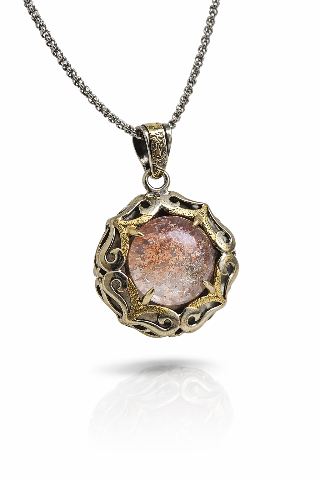 Este colgante artesanal en plata de ley 925 guarda en su interior una impresionante cuarzo lodolita, conocida como la “piedra paisaje” por las formaciones naturales que crea en su interior. Cada pieza es única, formada durante miles de años y trabajada a mano con detalle y dedicación.