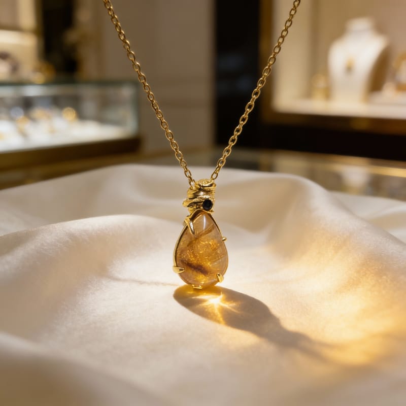Colgante de cuarzo rutilo en forma roca, engarzado en plata de primera ley 925ml , hecho a mano. terminado en plata dorada 18 kl