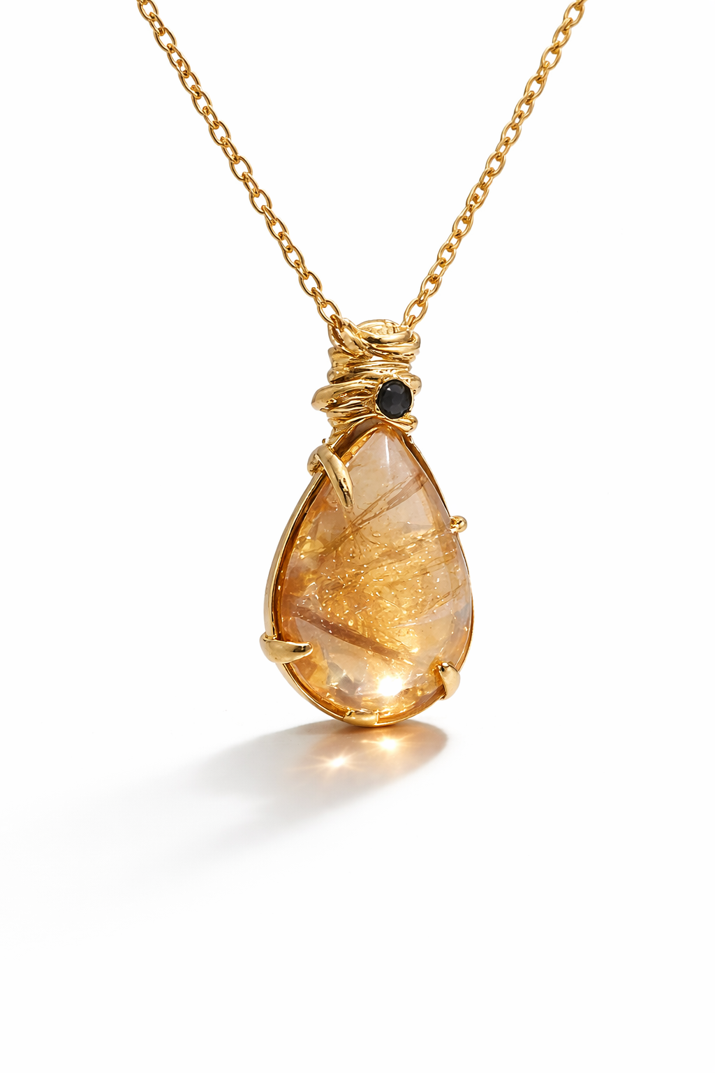 A mirar este colgante, parece que la luz queda atrapada en el cuarzo rutilo, donde finas agujas doradas dibujan un paisaje irrepetible.