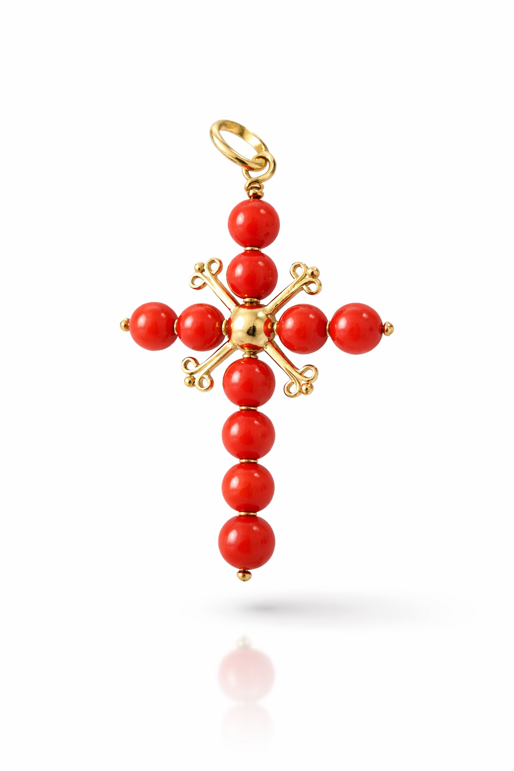 Cruz de bolas talladas de coral rojo natural, montada en oro. Hecho a mano