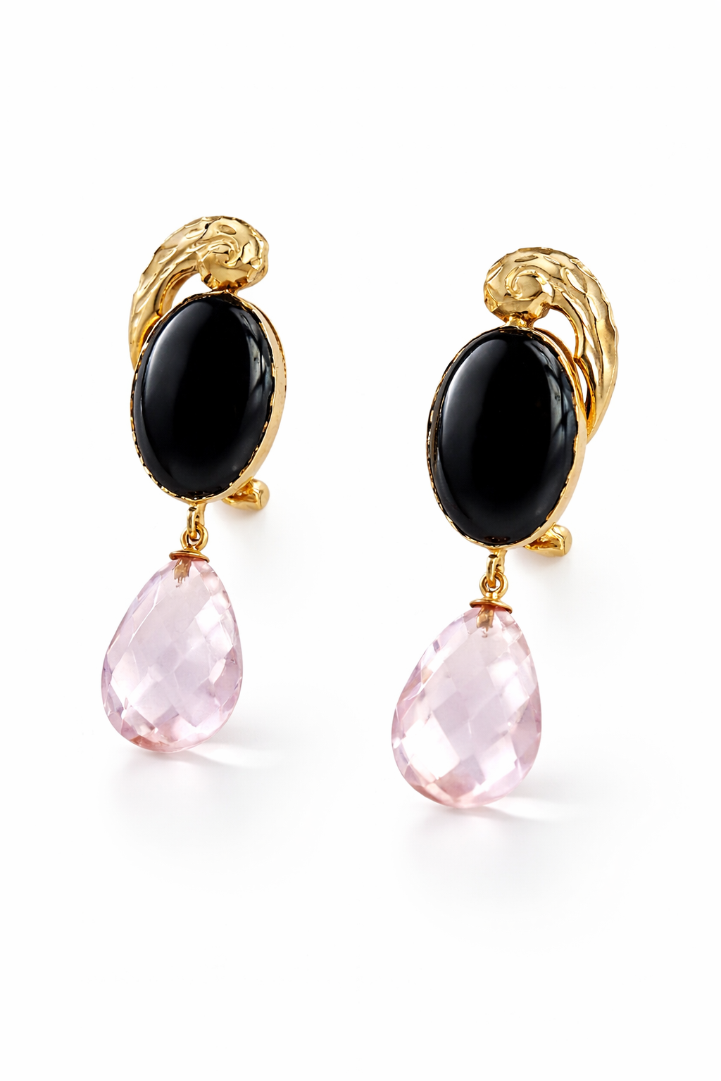 El protagonismo recae en el coral negro natural, de intenso brillo y profundidad, que aporta carácter y exclusividad a la pieza. Suspendida delicadamente, la morganita en talla lágrima añade un contraste suave y luminoso con sus tonos rosados, evocando feminidad y delicadeza.